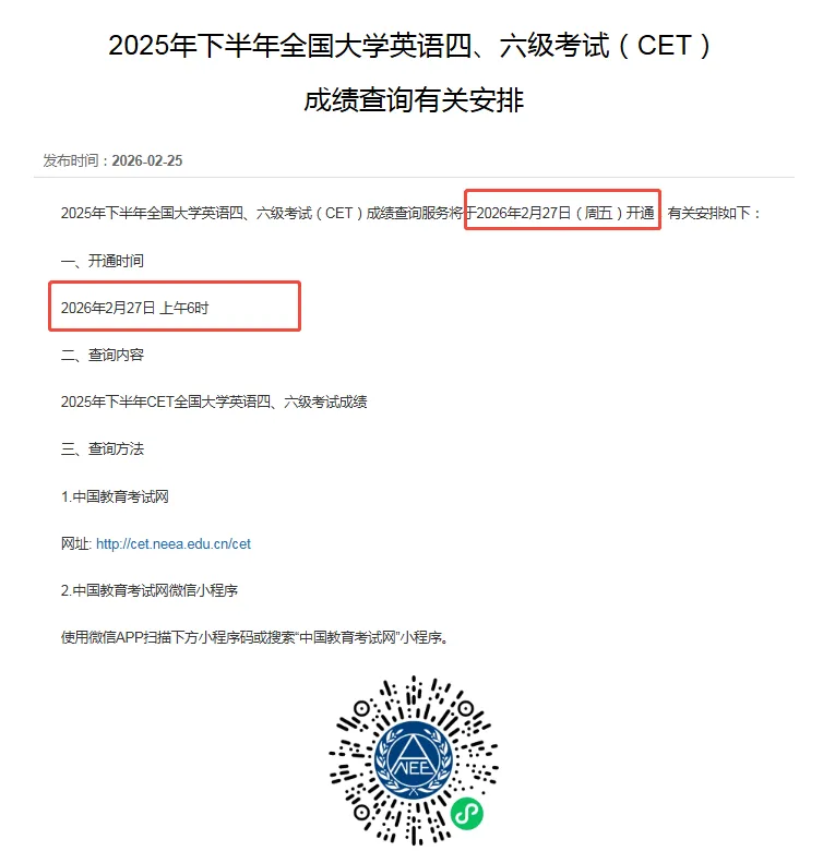 查分时间:2027年2月底