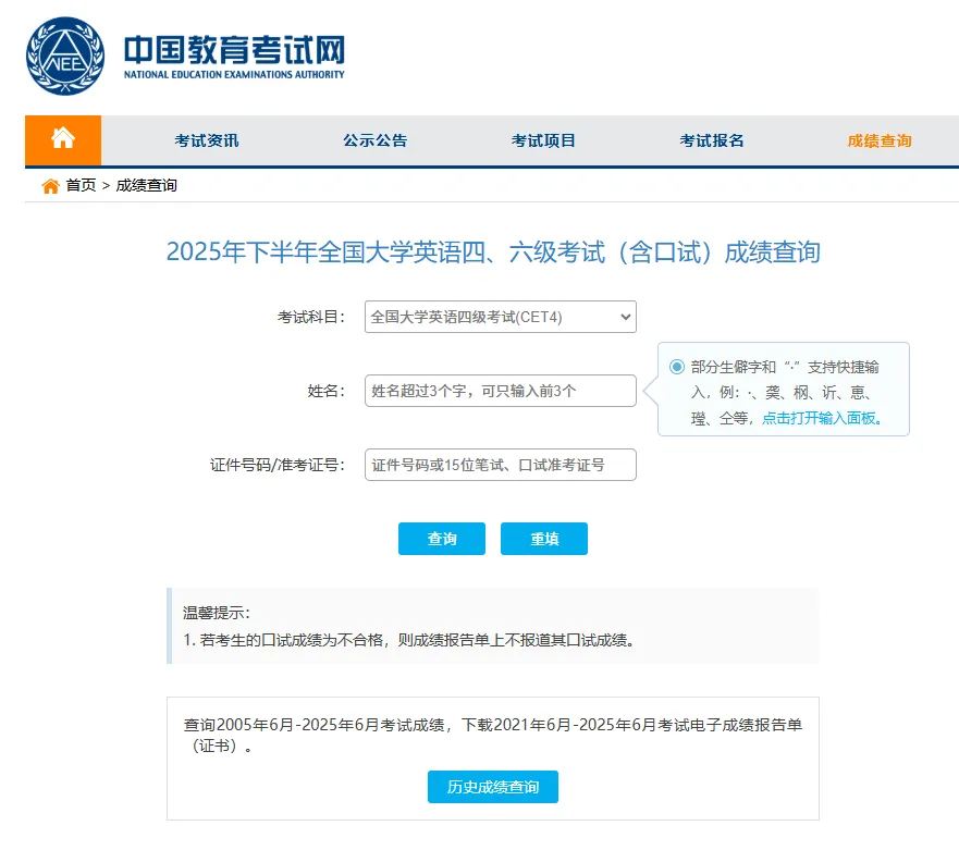 CET | 全国大学生英语四六级成绩查询(2025年12月考试成绩)