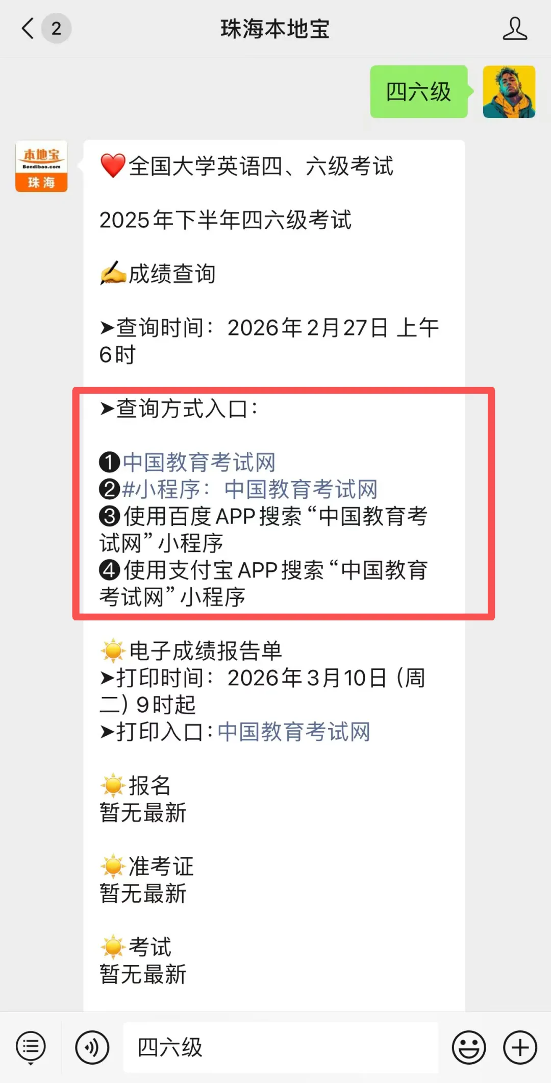 小编提醒:在【珠海本地宝】公众号对话框回复【考研】,可直接获取26考研初试成绩查询入口