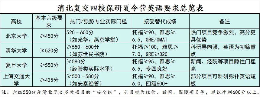 北京大学、清华大学、复旦大学和上海交通大学的保研夏令营对英语六级成绩的要求总体较高,但具体标准因校、因院系甚至专业方向而异。综合来看,复旦大学和清华大学部分强势专业要求最为严格,普遍将六级550分及以上作为实际门槛,复旦经济学院等热门项目虽未明文规定,但入营学生六级平均分达582分,竞争激烈;北京大学多数院系接受六级450分以上,但光华管理学院等经管类热门项目,有信息显示六级需达520分以上才具备竞争力;上海交通大学一般以425分为基本线,但部分学院或专业会提高要求,部分理工科专业甚至将门槛设为四级600分或六级580分。