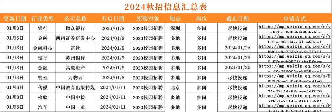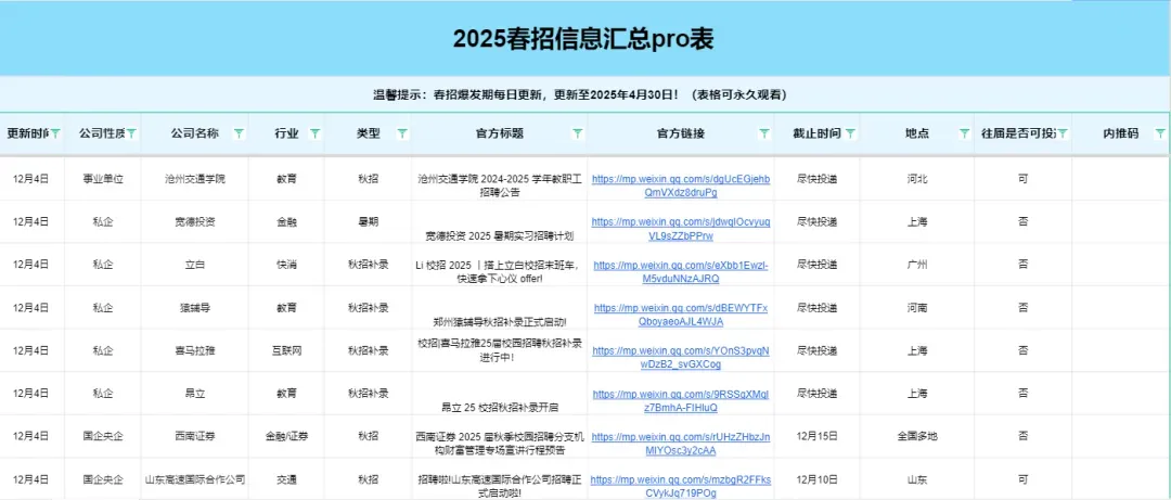 2:我们会定期整理汇总表,分时间:春招/秋招网申汇总表、寒暑假实习信息汇总表、远程实习信息汇总表等...分行业:国企央企汇总表/金融/咨询/互联网/事务所/快消岗位汇总表/国家部委招聘信息等等,每周第一时间分享到VIP会员群!部分展示如下👇
