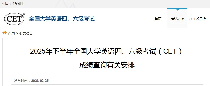 2025年下半年全国大学英语四、六级考试(CET)成绩查询服务于2026年2月27日(周五)开通,有关安排如下: