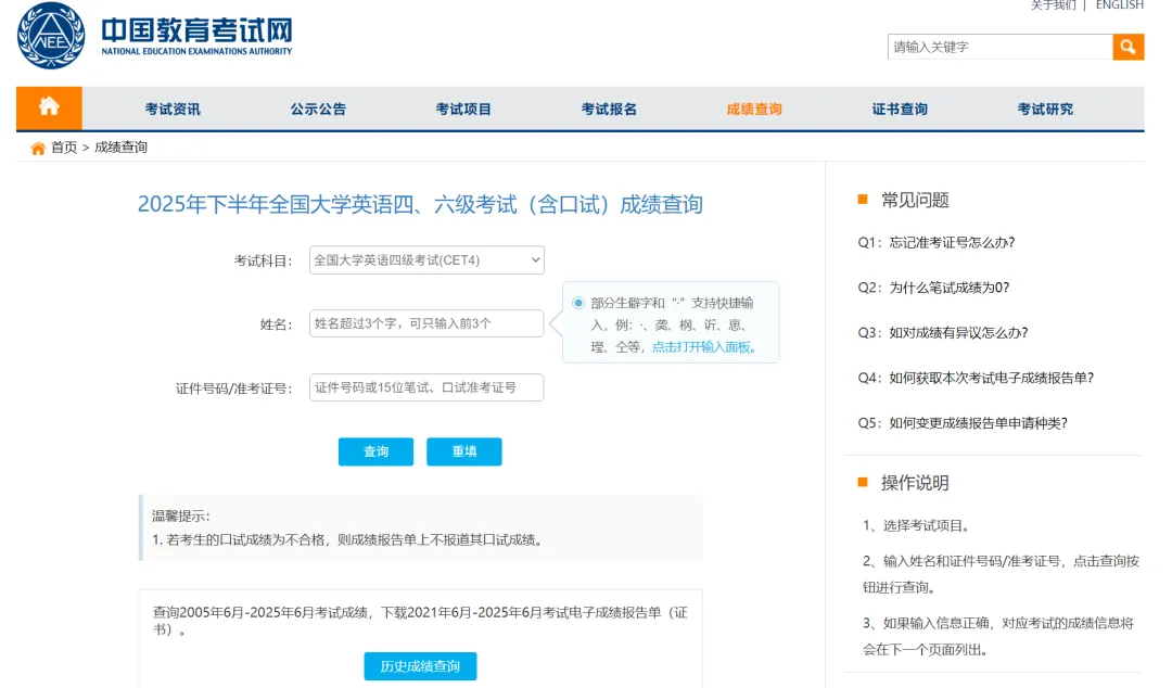 点击首页“成绩查询”栏目,进入CET成绩查询入口,输入姓名、证件号、准考证号查询。