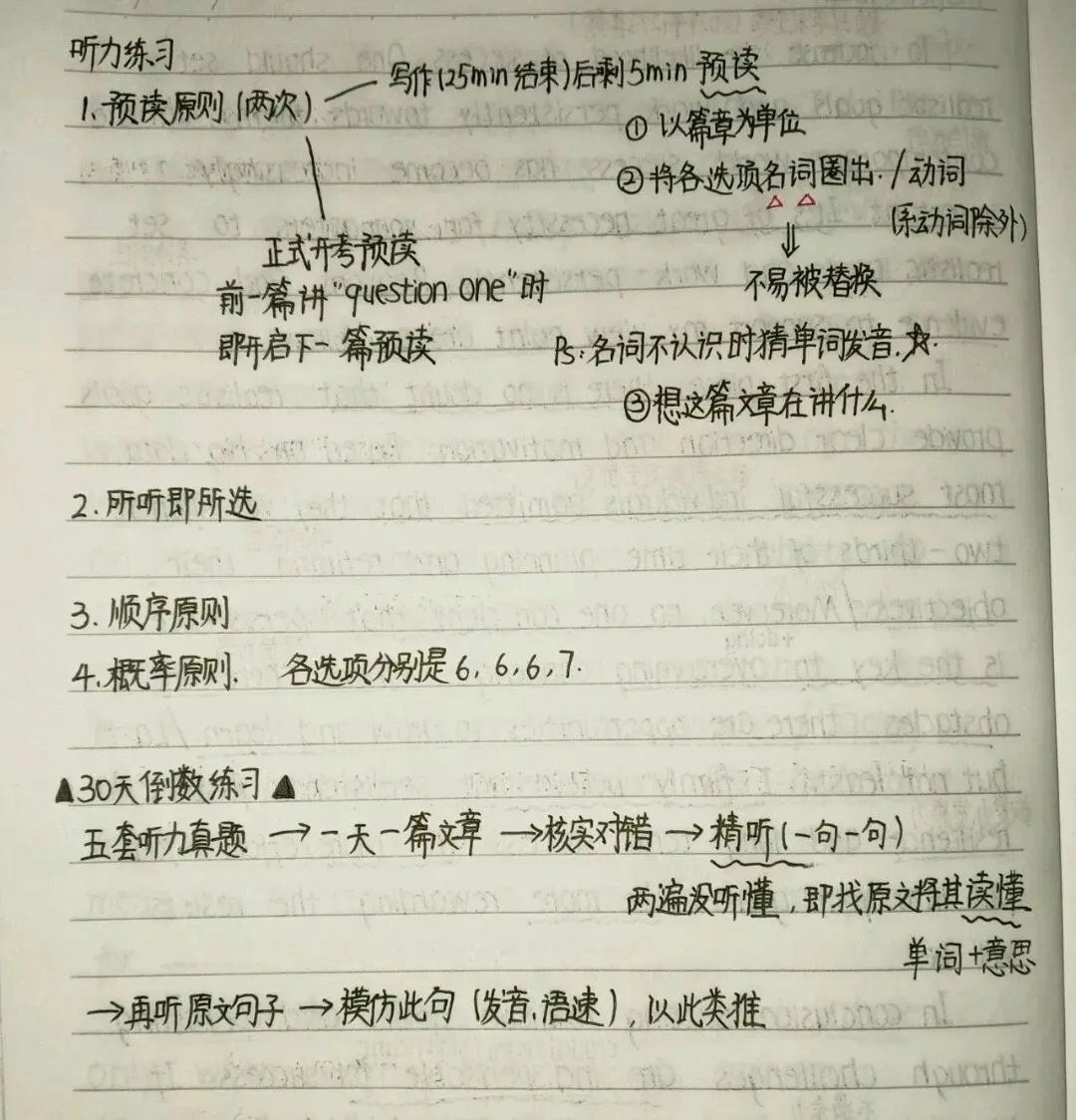 很多伙伴平时一般都很少练习听力,但在考前一个月真心建议你一定要每天都练,很有效果!如果某天时间少,也尽量让自己听一小段,磨下耳朵。利用录音读题干时间去读选项,圈出名词(不容易被替换)、部分否定词、动词,帮助理解选项的都可以划出,切记不要一整句全部划,因为容易看花眼!