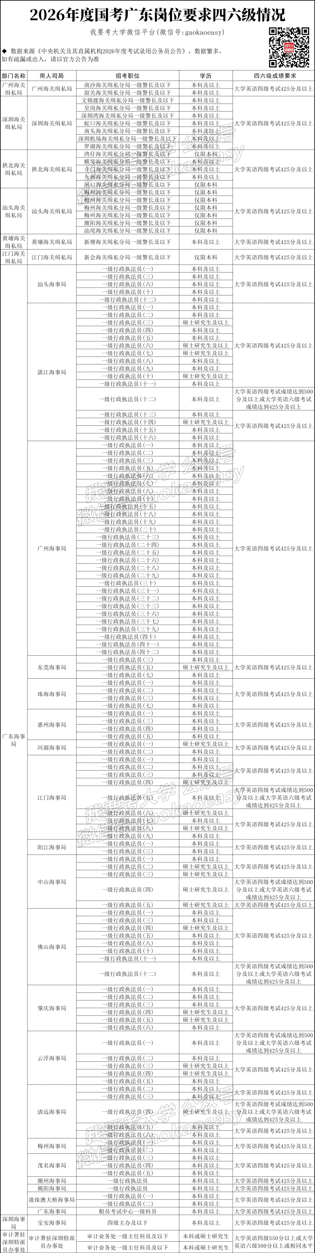 以2026年度国考为例,全部20714个岗位中,有4463个岗位明确要求四六级成绩,占比达22.5%,这意味着,平均每5个岗位中,就有超过1个将其设为报考条件。具体到广东,1869个岗位就有866个岗位对四六级成绩有要求。其中,本科生岗位多数只要求四级考试425分及以上,部分海关、海事、税务岗位要求四级500分或六级425分。 ①保研:英语四级证书是保研的硬性要求,有的学校会提出更高要求,比如上海交通大学要求学生通过六级考试才能申请保研资格。除了通过四六级的单一规定外,还有部分学校有“满足其一”即可的要求,在通知中的表述通常为“通过六级或四级达到x分以上”,如中大↓《中山大学推荐应届本科毕业生免试攻读研究生工作实施办法》