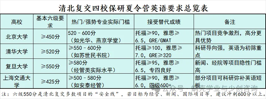 绝对门槛:对于清华、北大、复旦、上海交大等顶尖高校的王牌专业(如金融、计算机、法学),其夏令营或推免招生简章中,可能会将英语门槛设为600分。这是筛选“尖子中的尖子”的标准。
