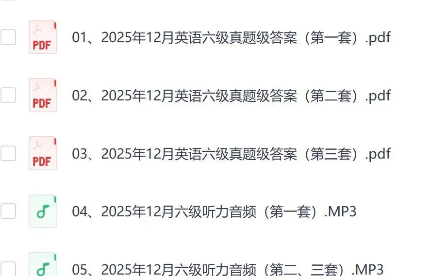 2025年12月英语六级真题试卷及答案解析(第二套)2025年12月英语六级真题试卷及答案解析(第三套)https://pan.quark.cn/s/440110ac5d2c复制以上链接打开「夸克」APP即可保存