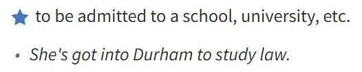 She was admitted to her dream graduate school.她被自己心仪的研究生院录取了。His dream was to be admitted to a key university.get in在《牛津辞典》中可以表示“被录取、考上”,英文释义: