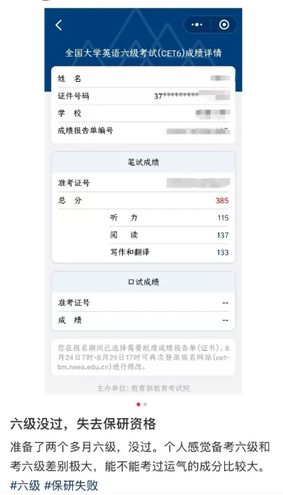但不可否认的是,在大多数情况下,四六级成绩仍是保研过程中成本最低、认可度最广的英语能力证明。想要走得更远,拿下这张“通行证”仍然是最稳妥的选择。