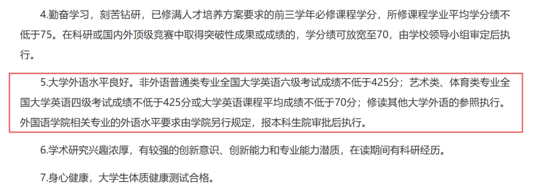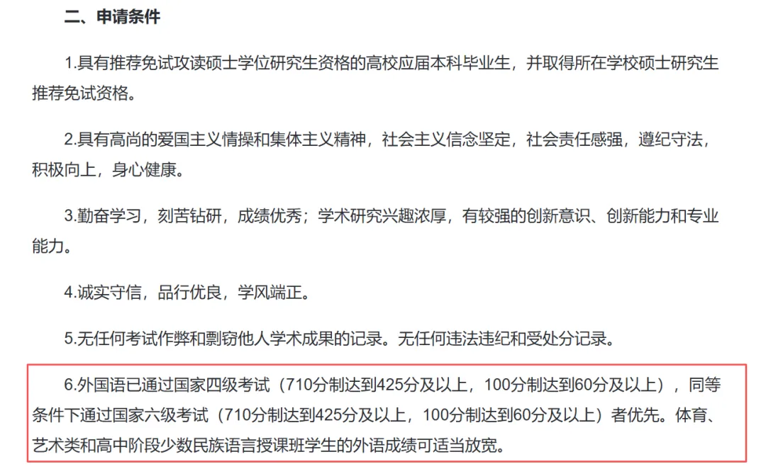 学校规定,申请者外国语需通过国家四级考试(710分制达到425分及以上),但同时明确“同等条件下通过国家六级考试(710分制达到425分及以上)者优先”。