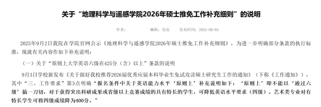 广州大学地理科学与遥感学院2026年硕士推免工作补充细则中明确:“原则上大学英语六级在425分(含)以上”。乍一看,这是标准的六级要求,但仔细阅读会发现其中的“弹性空间”。