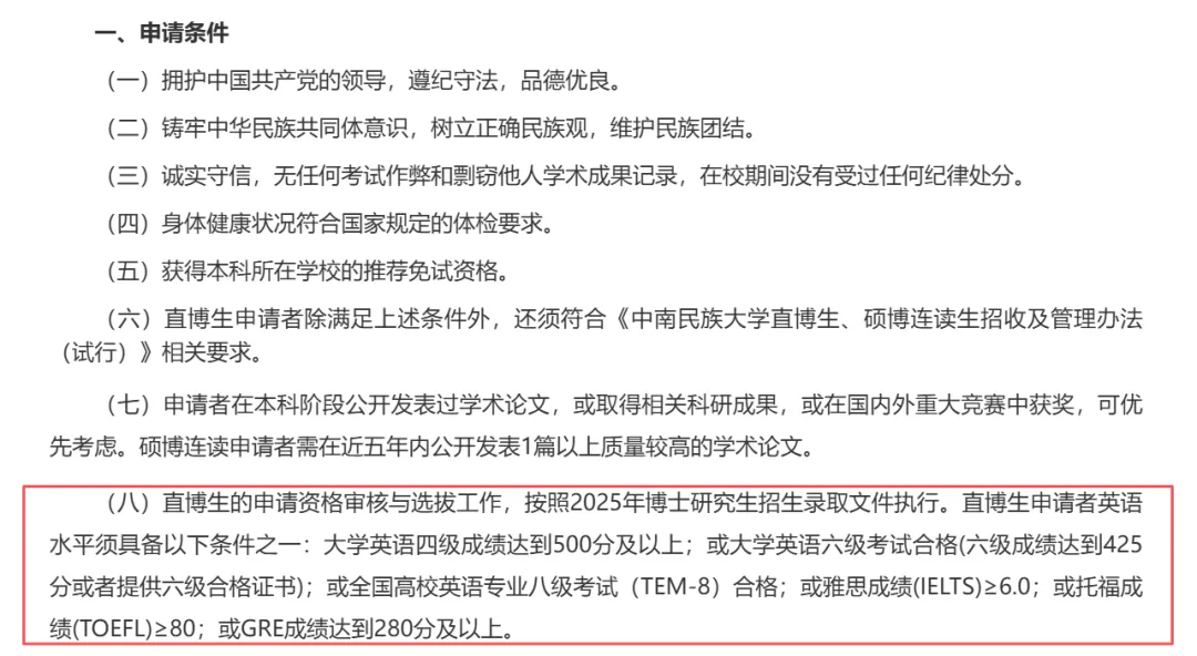 除上述三所高校外,其他院校的英语要求也各有特点。武汉大学艺术学院对艺术类考生的英语要求相对宽松——国家英语四级考试425分及以上,或雅思成绩5.5分及以上,或TOEFL成绩80分及以上。而中南民族大学民族学与社会学学院对直博生的要求则更高:四级500分及以上,或六级425分及以上。