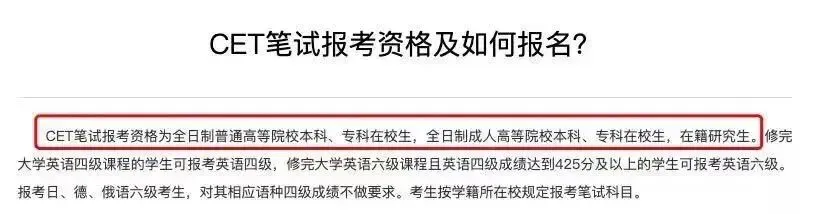 根据四六级官网的报考资格可以看到:CET笔试报考资格为全日制普通高等院校本科、专科在校生,全日制成人高等院校本科、专科在校生,在籍研究生。