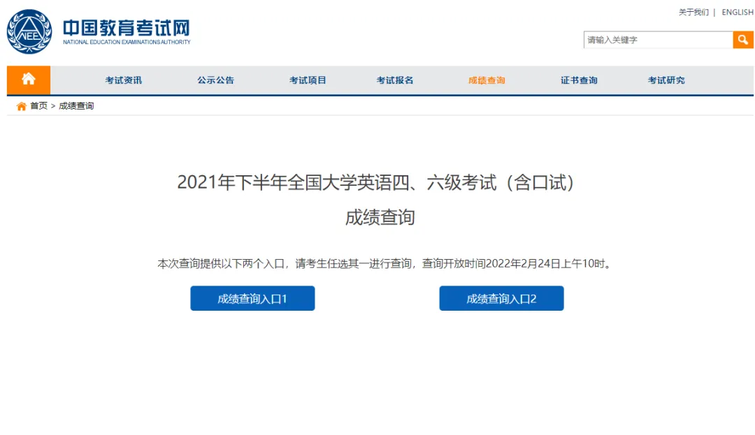 2021年下半年全国大学英语四六级考试(CET)成绩查询服务于2022年2月24日开通。