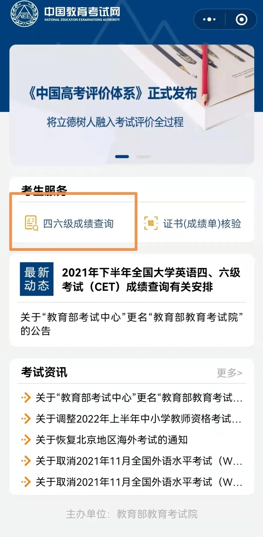 微信小程序搜索中国教育考试网查询窗口
