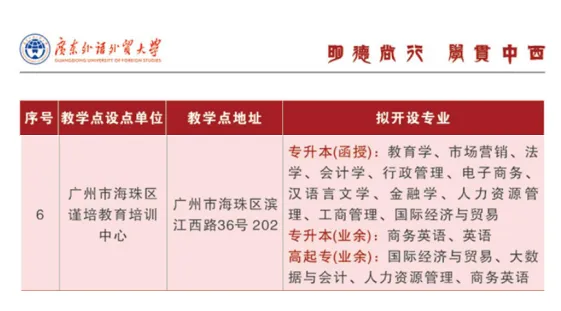 广州海珠谨培是广东外语外贸大学的合作办学单位,官方授权校外函授站,毕业学习有保障~广大考生认准大学官方合作单位。