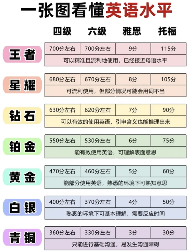 网上流传着一份“四六级分数水平对照表”,结合你12月份四六级成绩,大家都位于什么水平呢?