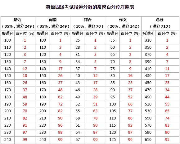 英语四级考试报道分&百分位对照表: