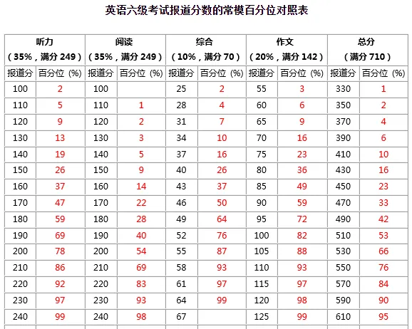 英语六级考试报道分&百分位对照表: