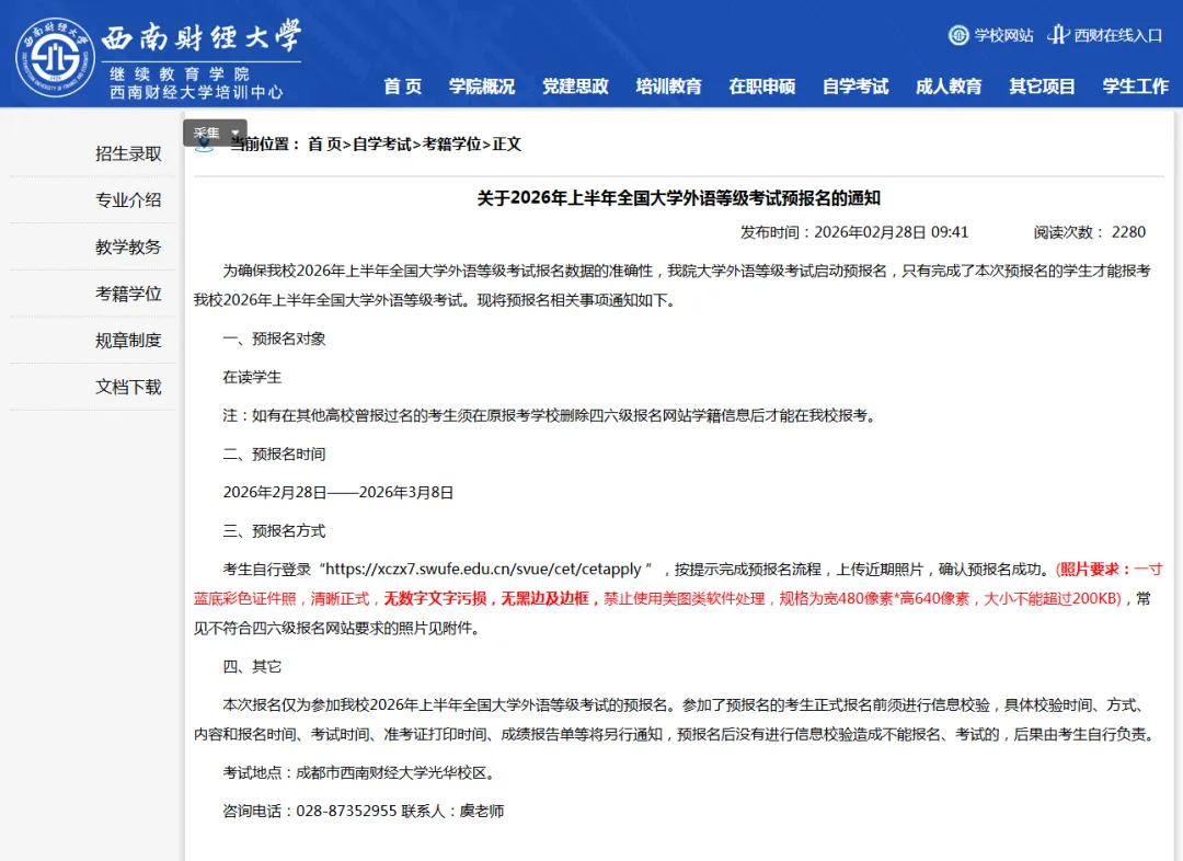 📢西南财经大学2026年上半年全国大学外语等级考试预报名通知: