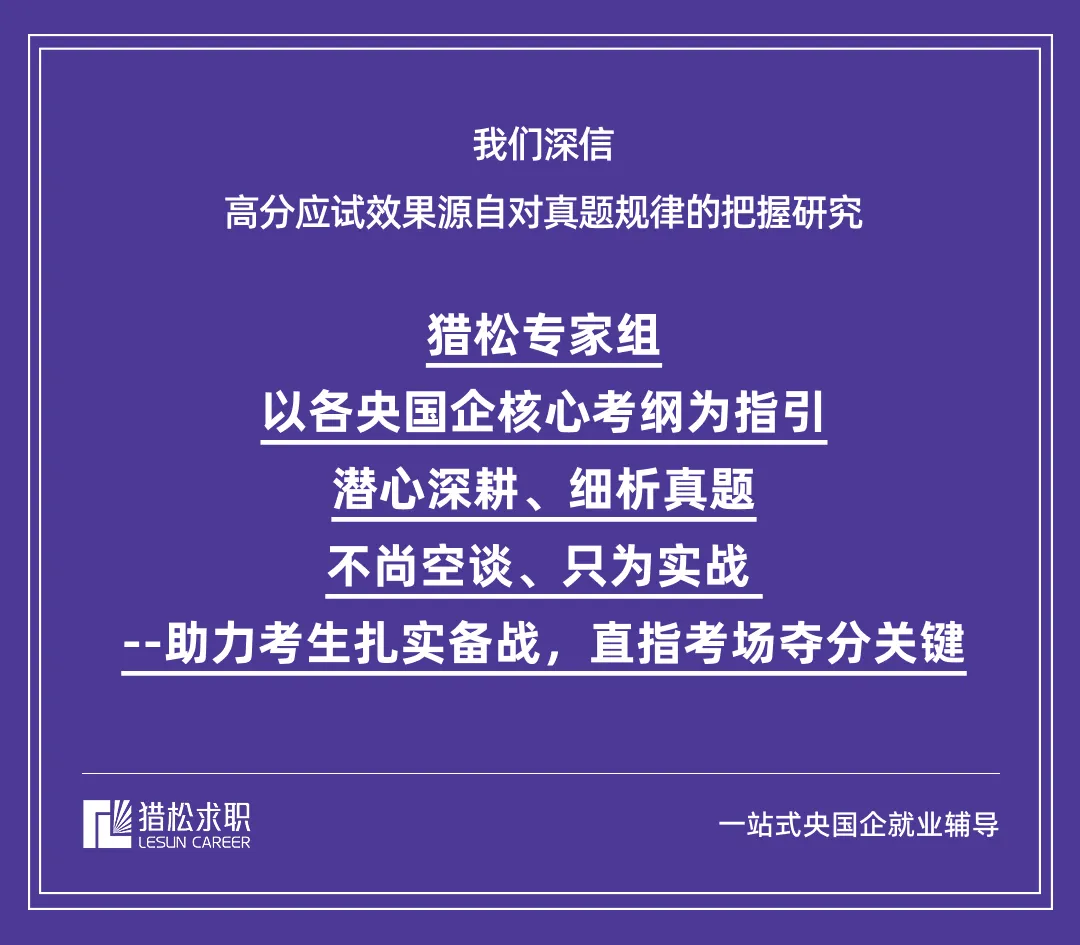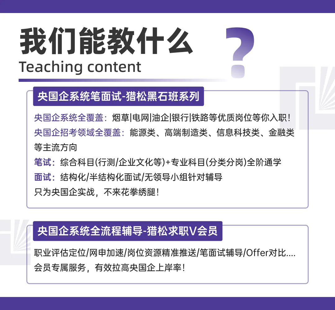 我们不仅解析各央国企真题,更致力于解读每家央国企的选人逻辑与文化基因。依托丰富的领域资源积累,及对电力、能源、烟草等系统招考规律的持续追踪,为不同专业背景的同学精准定制备考策略,直击央国企考核核心!