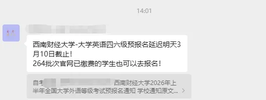 重磅消息!还有谁不知道,西南财经大学可以不用等注册考籍或者小自考考籍上有一门合格成绩才能报考!接最新消息,西南财经大学英语四六级预报名延迟到明天3月10日,且264次(264次是今年5月才注册的批次)只要官网缴费就可以报名!对于想要赶上26年上半年英语四六级考试的同学来说简直是福音!英语四六级,不止是一张“及格证”