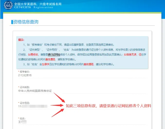如提示"通行证信息与学籍信息不一致"您须仔细核对资格信息查询页面显示的个人信息正确与否。