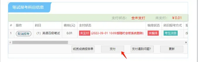 (支付按钮可因您的登录设备显示位置不同,请刷新页面后仔细查找)若没有报考科目,请通过笔试/口试报考按钮进行选择后再支付。