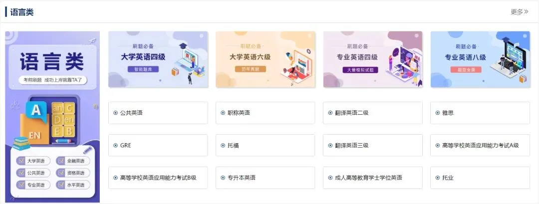 攻略:进入首页—下拉至“语言类”—大学英语四级/六级、高等学校英语应用能力考试A级/B级