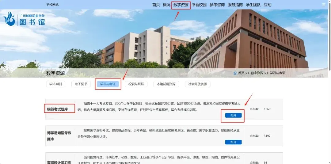在校园网范围内,进入所在学校的图书馆网站首页,点击进入“银符考试题库”首页。