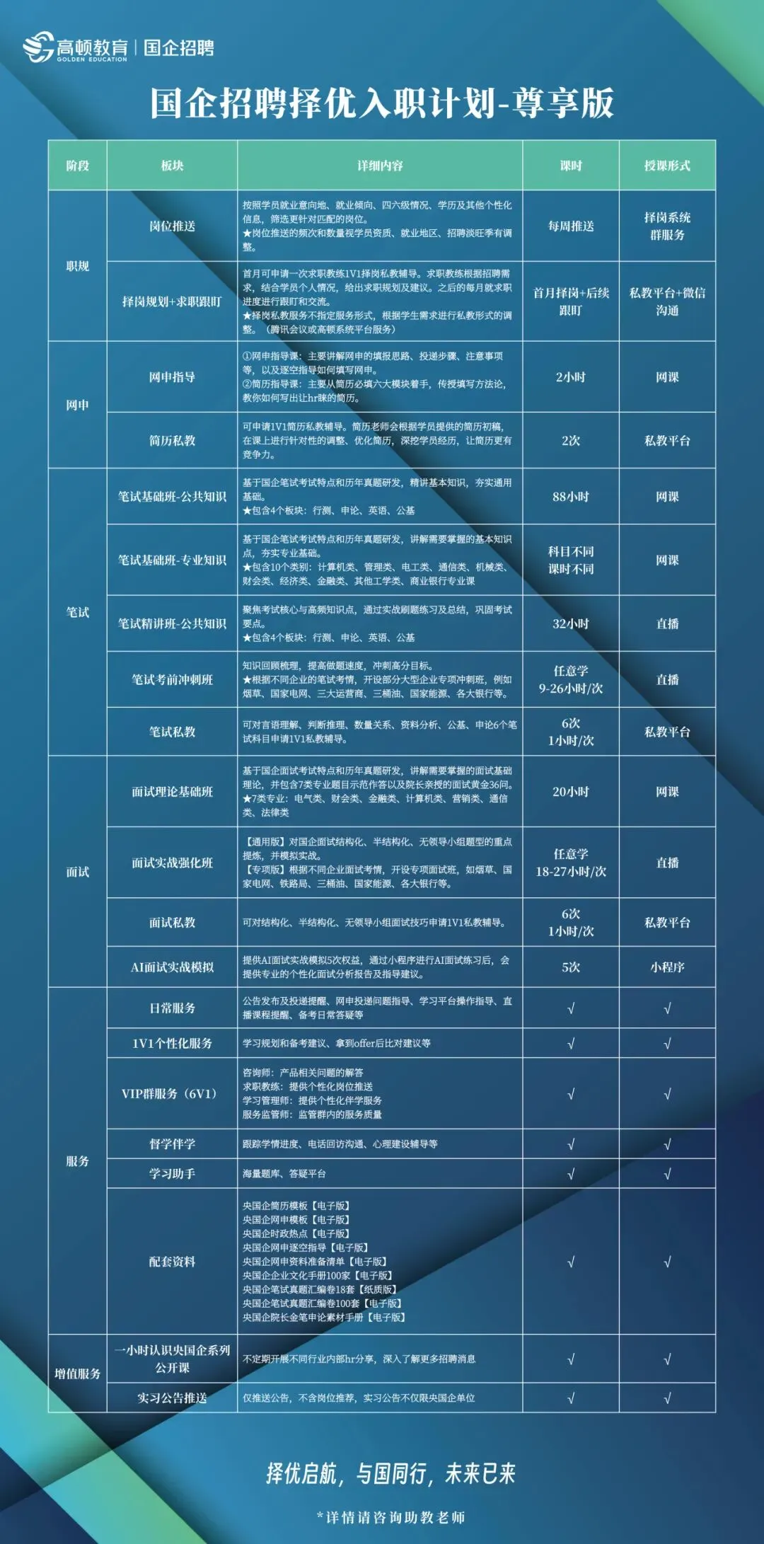 高顿央国企班分为经典版和尊享版,两款课程均覆盖职规、网申、笔试、面试全流程,根据自身需求选择即可: