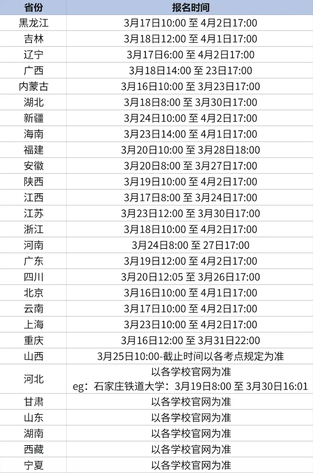 从上图中能清晰看到,各省报名窗口集中在3月16日-3月25日启动,整体截止时间跨度较大,最晚至4月2日17:00。