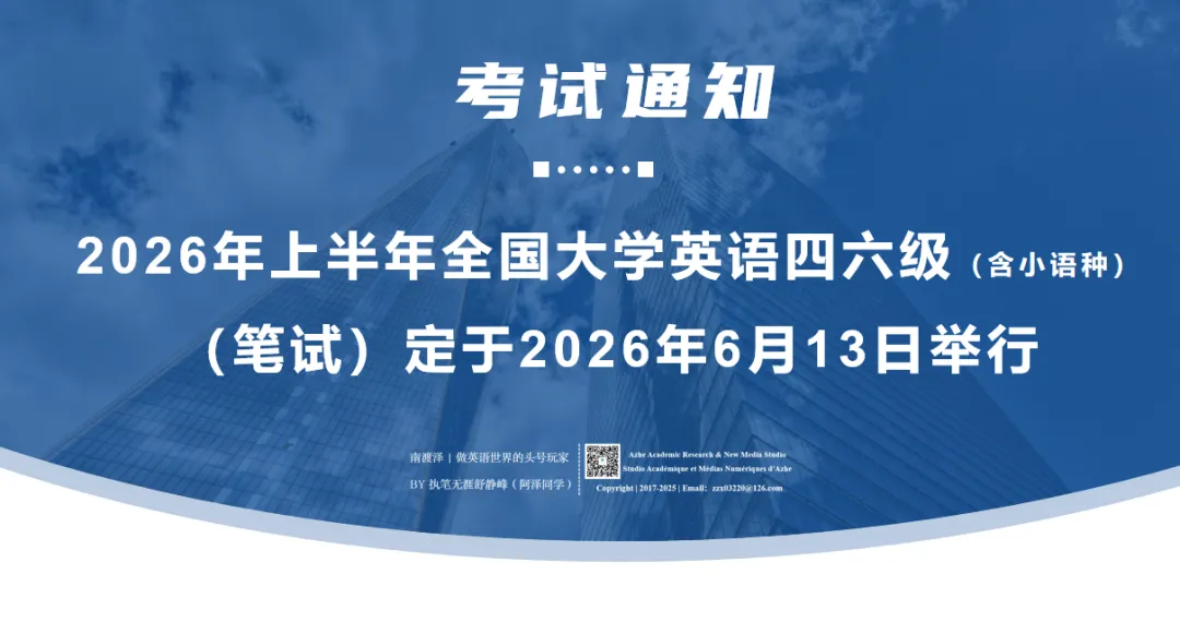 2026年上半年全国大学英语四六级(含小语种)口试、笔试报名时间为3月17日8:00-3月24日17:00。