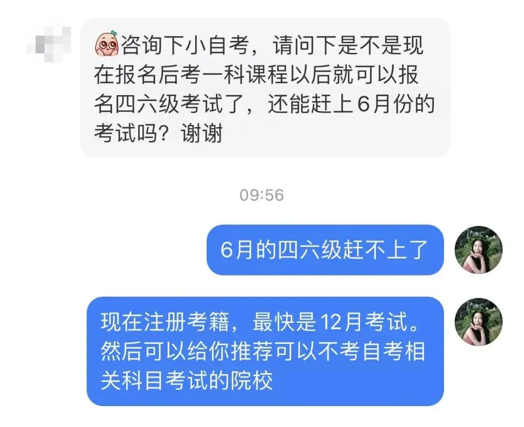 现在注册考籍报考四六级,最快参加9月报名四六级,12月考试然后最近问的比较多的是今年6月的还能赶上不,很遗憾,上半年的预报名已经截止了,报不了了同学们!!已经毕业了/ 在职的社会人员,如果还想参加英语四六级,怎么报考?费用多事啊?是否需要本人考试?哪里考?跟之前的全日制学历有冲突吗?会上学信网吗?确定报考院校 → 报名注册四川小自考考籍 → 确认信息及采集照片 → 9月预报名 +正式报名四六级 → 12月参加考试这两个学校注册考籍之后,不需要参加自考相关的任何科目考试。注册就可以四六级。只需要来四川参加四六级的考试。 交一年学费有2次考试机会。重点:学费本人交予学校官方平台。个人及站点不代收。具体操作流程可扫描文末二维码在线咨询,或添加微信:17780011992小张老师 需要!需要!需要