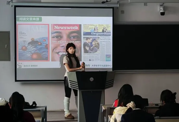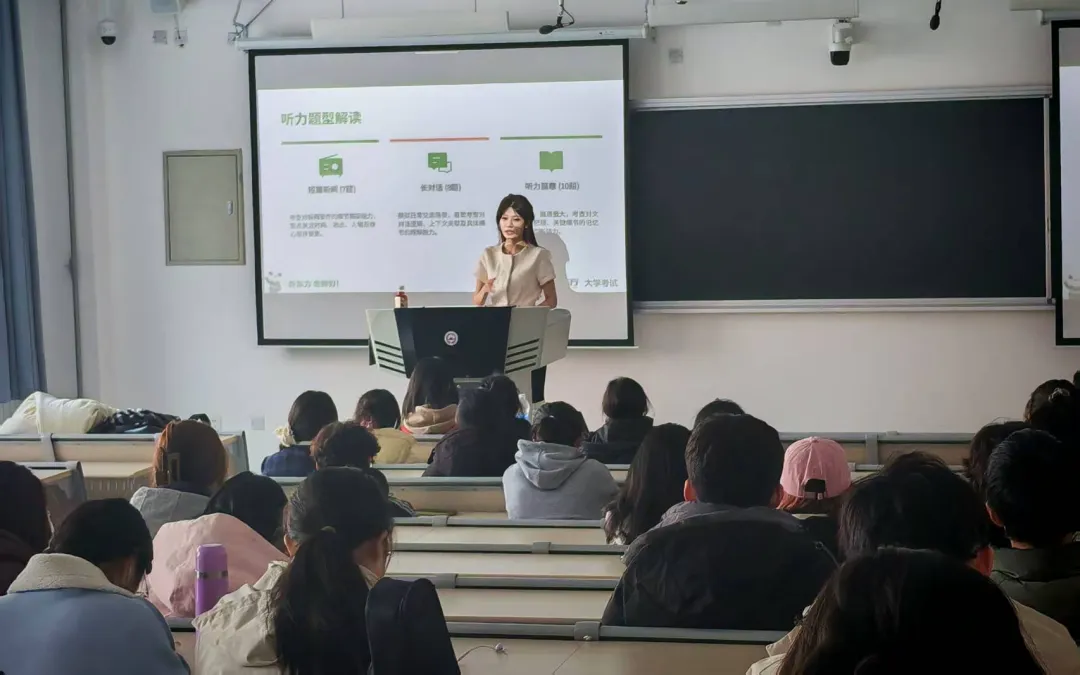 陈雨天老师首先从备考方法论入手,系统拆解了四六级考试的各大题型。在听力部分,她详细讲解了如何通过关键词定位和场景联想提高答题准确率;阅读模块则重点介绍了“篇章结构分析”与“同义替换”的解题逻辑,帮助同学们跳出误区。