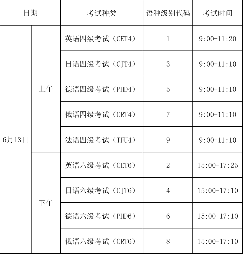 2026年上半年全国大学英语四、六级考试口试(以下称CET-SET)和笔试(以下称CET)将分别于5月23日至24日和6月13日举行。其中,口试于5月23日开考英语四级、5月24日开考英语六级,笔试于6月13日上午开考英语(日语、德语、俄语、法语)四级、下午开考英语(日语、德语、俄语)六级。现将有关报名事项通知如下: