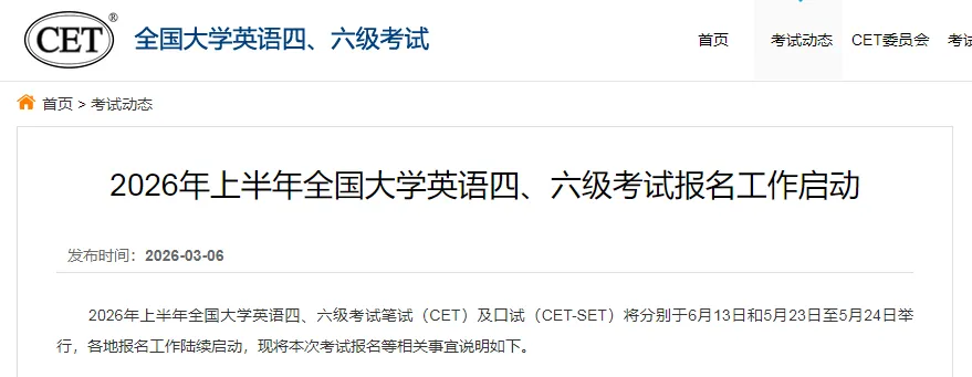 2026 年上半年全国大学英语四、六级考试报名工作将于3 月 18 日 10:00正式启动。口语考试安排在5 月 23 日至 24 日,笔试则定于6 月 13 日举行。具体报考流程及注意事项,一起来了解。