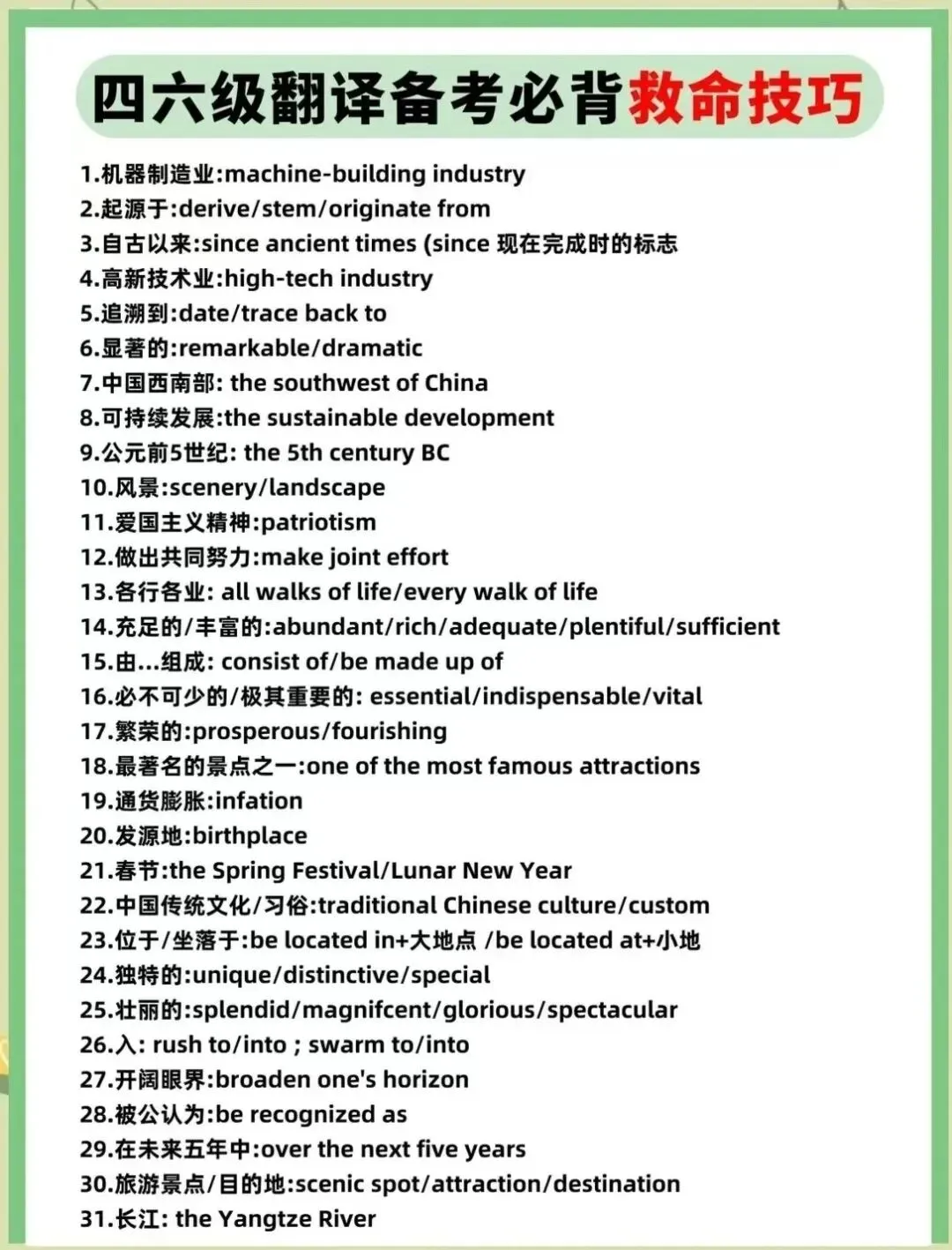 >25年英语四六级翻译必背词组(后附常用短语)
