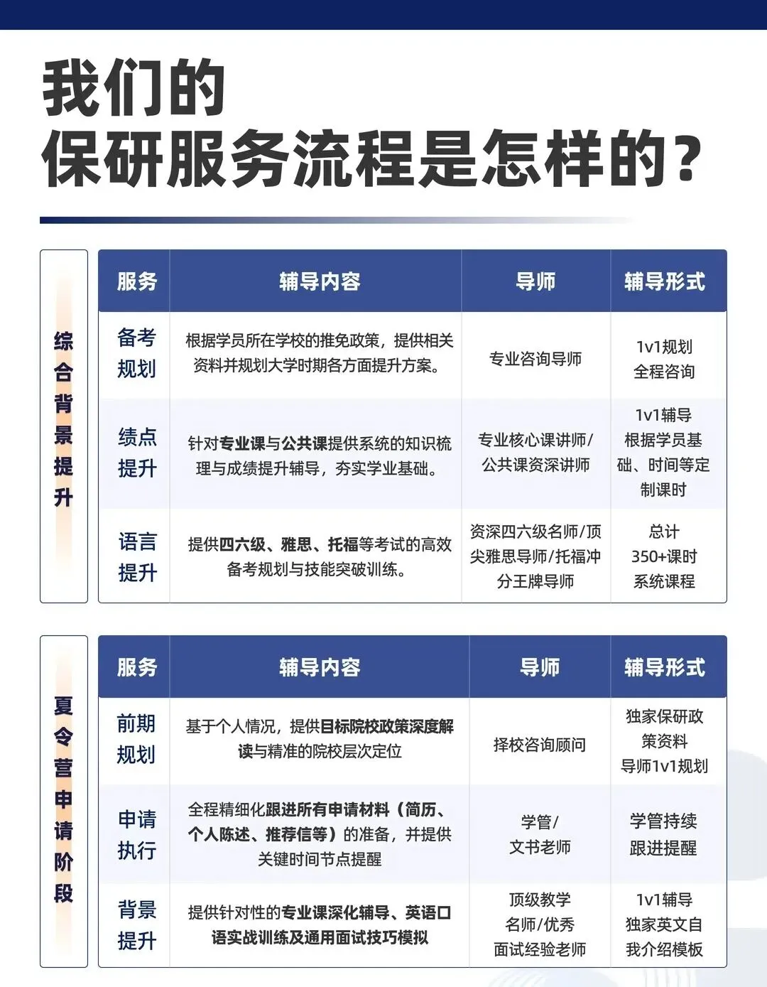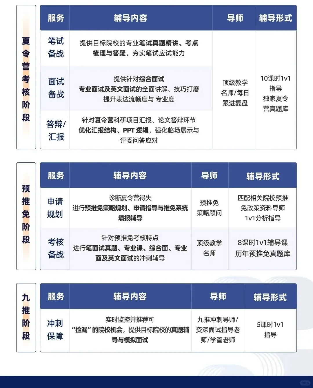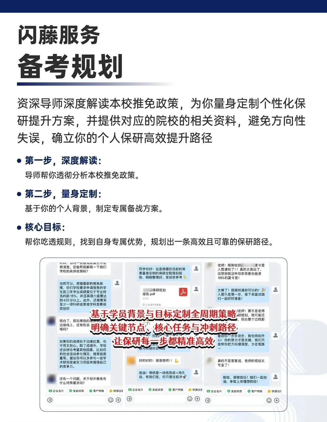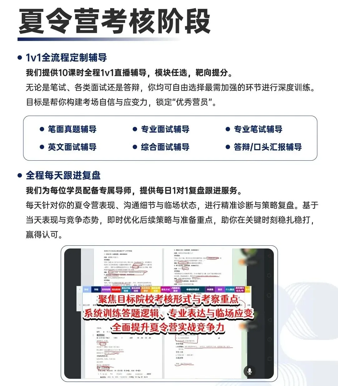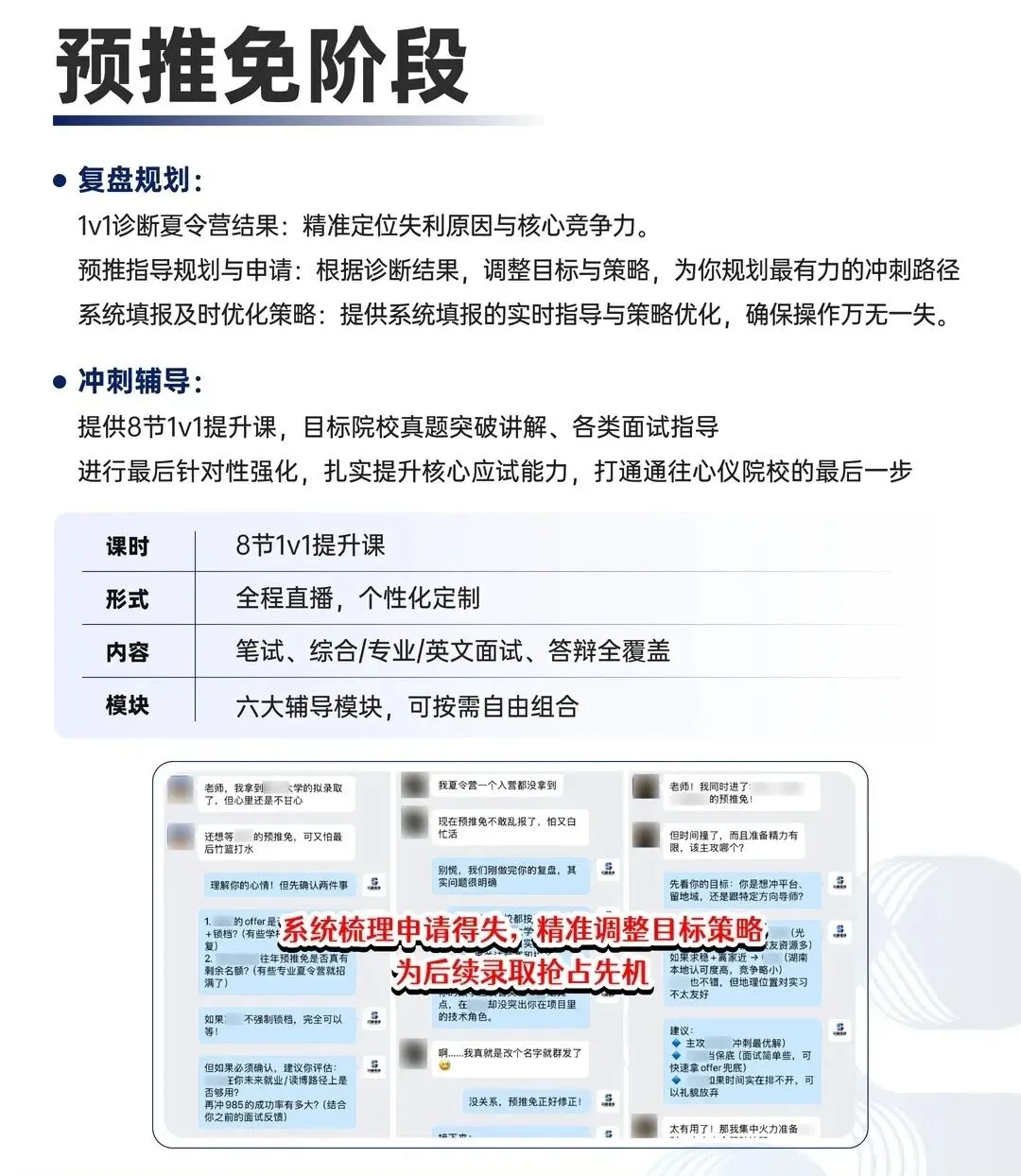 1v1全流程定制辅导,模块任选深度训练,靶向提分锁定优营;专属导师全程每天1V1跟进诊断复盘,即时优化策略