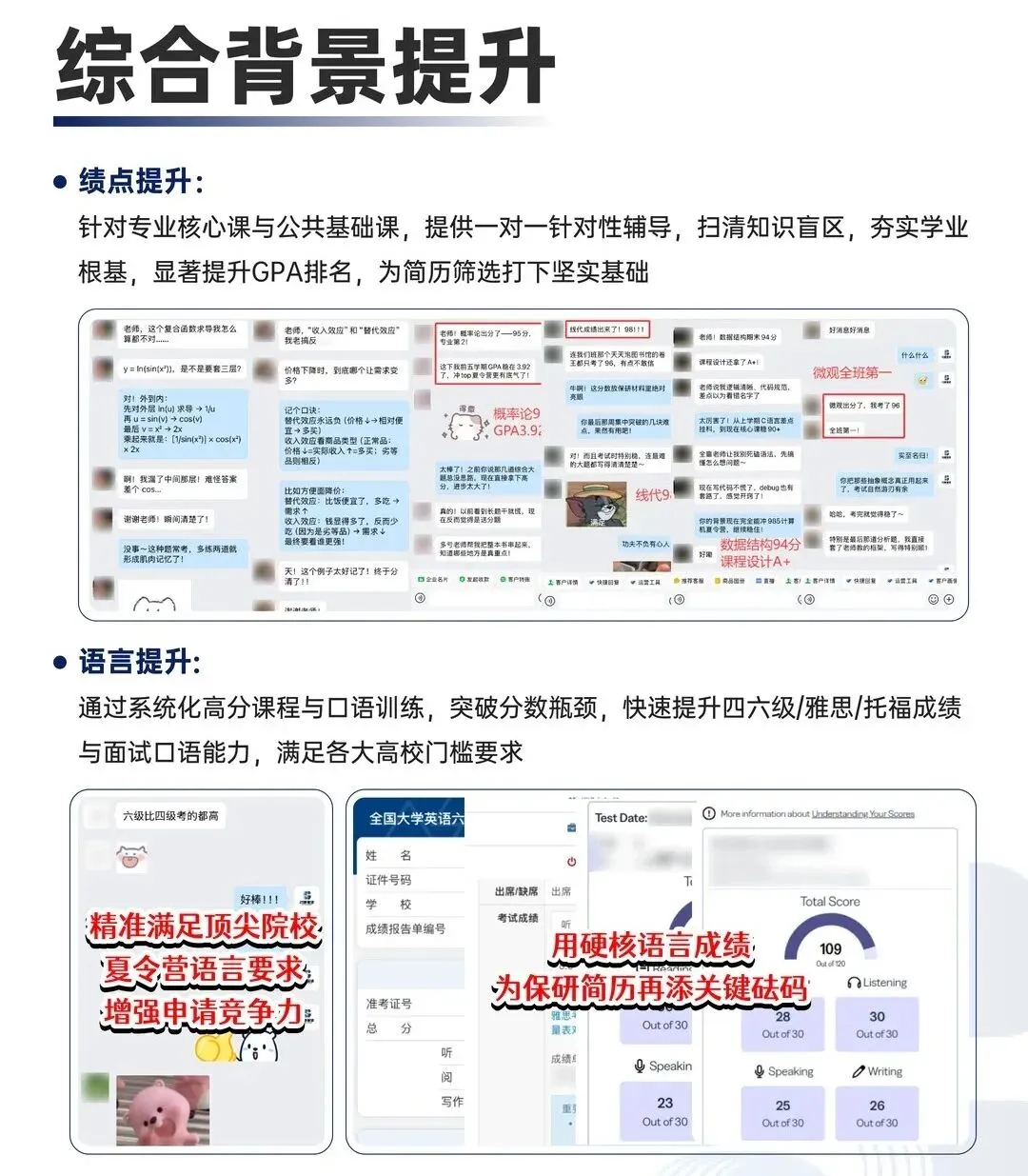 针对性辅导专业核心课与公共基础课,提升GPA排名;系统化高分课程与口语训练,突破分数瓶颈