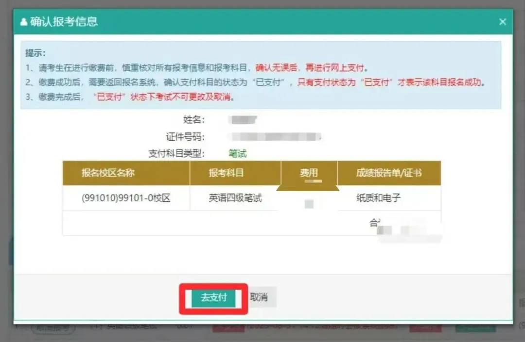3. 考生要在规定缴费时间内完成网上缴费。如CET和CET-SET兼报,应先缴CET报名考试费,再缴CET-SET报名考试费。如未在规定时间内完成缴费,系统将在24小时后删除考生报考信息。信息删除后,在报名规定时间内考生可重新报考。报名成功的唯一标识是:对应科目的支付状态为“已支付”。 一旦报名缴费成功,所有信息不得改动。