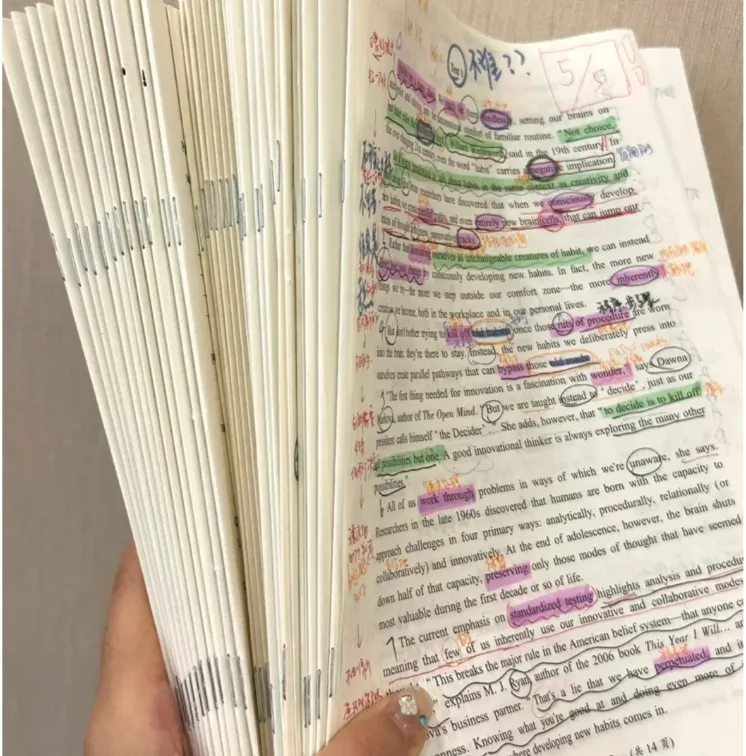 2、处理文章:把握文章的主题和结构,找到每道题在文章中的定位出处,重点看考点句;