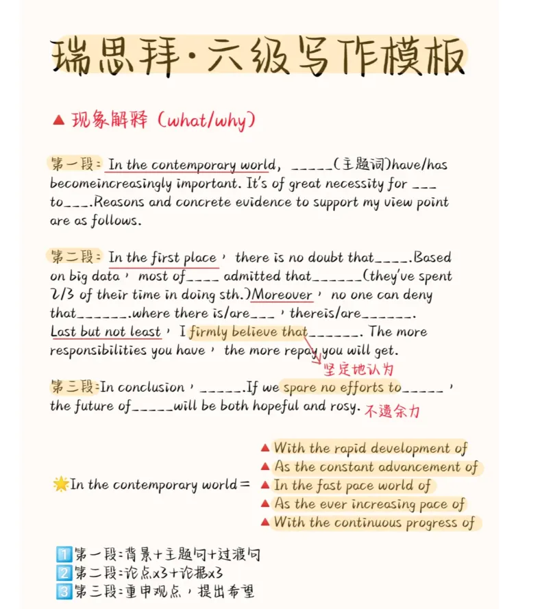 四六级作文一般都可以拆成 18 句话,套路句分开头、主体、结尾,三步走。这18句话,分配到每部分分别是2-4句、9-11句话、2-3句话。