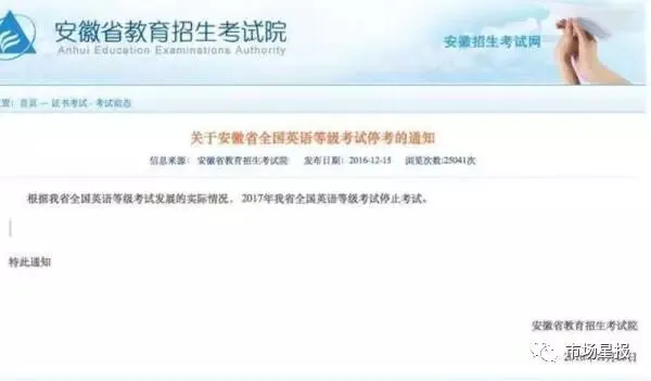 12月15日,安徽省教育招生考试院发布通知:根据我省全国英语等级考试发展的实际情况, 2017年我省全国英语等级考试停止考试。