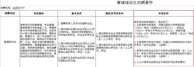 以下是中国工商银行北京分行2017年度校园招聘的外语要求:
