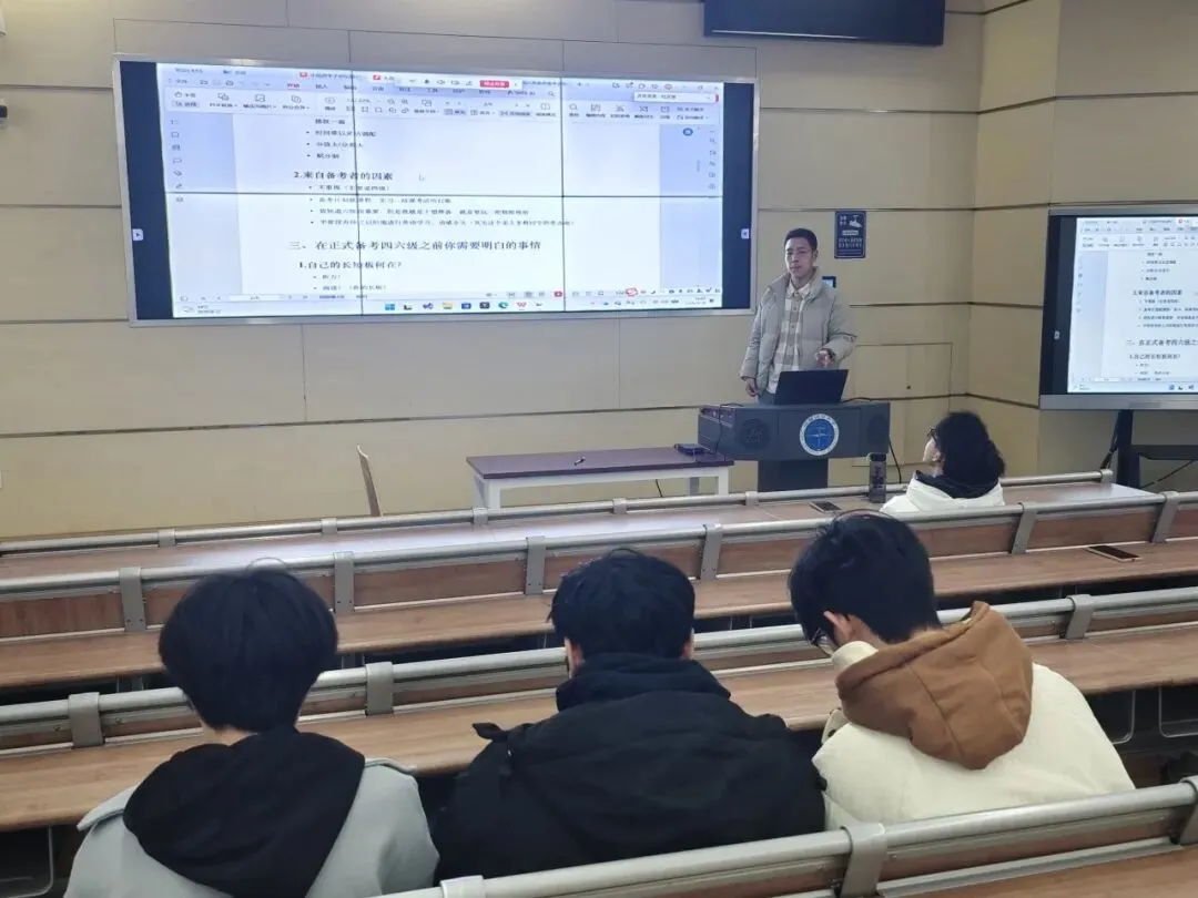 他首先为同学们梳理了四六级的分值分布、题型结构与时间规划,明确了听力、阅读、写作、翻译各板块的核心拿分点;随后,拆解了阅读三大题型的高效答题技巧,给出仔细阅读“题干定位+同义替换”、长篇阅读“先题后文+关键词匹配”、选词填空“词性预判+固定搭配”的速解方法,同时分享了听力、写作与翻译的提分关键;最后,他聚焦英语长期素养培养,讲解了科学背单词的方法、精听+泛听的听力训练模式,并推荐了适合四六级水平的英文读物,让同学们明白“速成只能过关,坚持才能真正学会英语”。