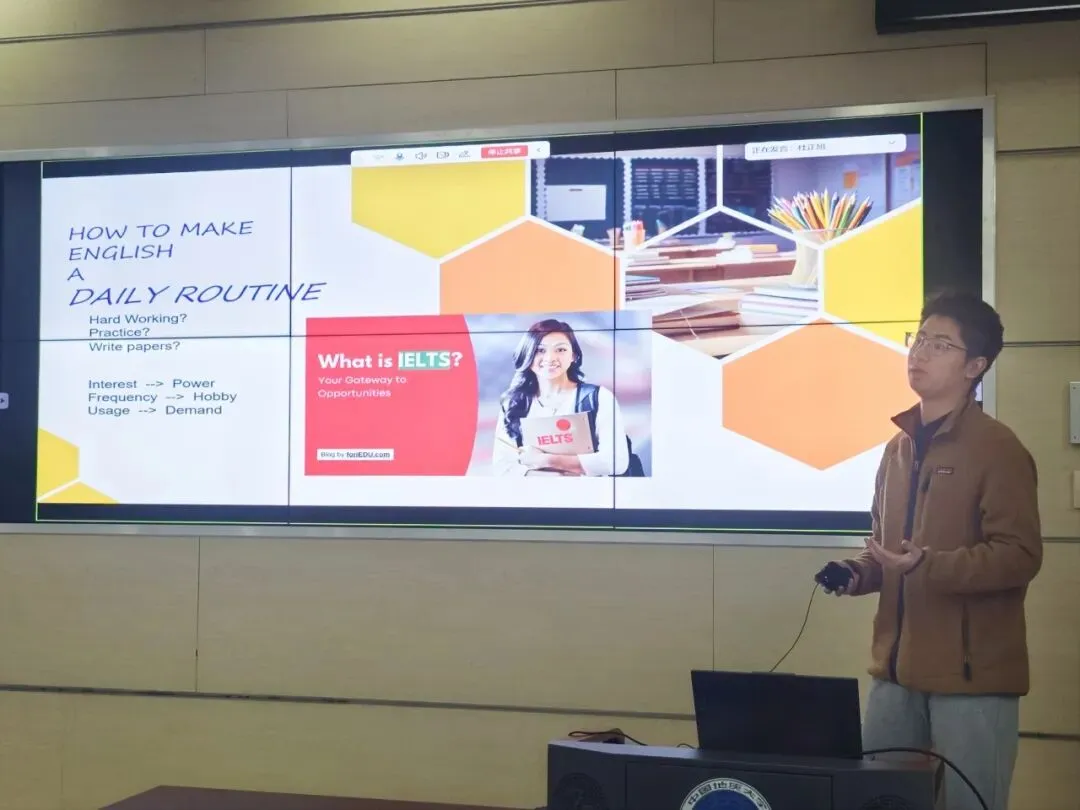 雅思7.5、四级618的吴宇轩同学,从“四六级+雅思”双视角为同学们带来英语备考与学习的全新思路。他提出“Interest→Power、Frequency→Hobby、Usage→Demand”的英语学习核心逻辑,从如何养成英语学习兴趣、搭建沉浸式英语环境、四六级与雅思备考差异三个方面展开分享。