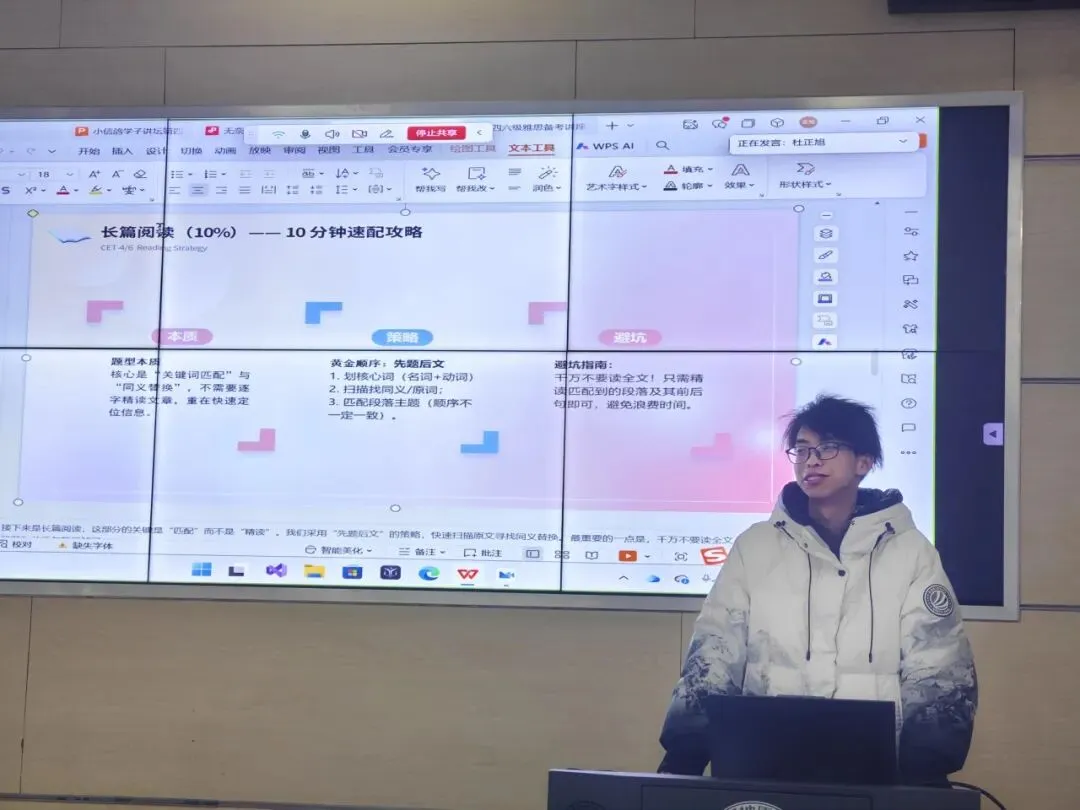 杨晨阳同学以“四六级快速提分+长期语感养成双驱动”为核心,为同学们带来兼顾应试与能力的四六级攻略,秉持“让大家既能高分过关,又能爱上英语”的分享初衷,从四六级扫盲、答题技巧、素养培养三个维度展开细致讲解。