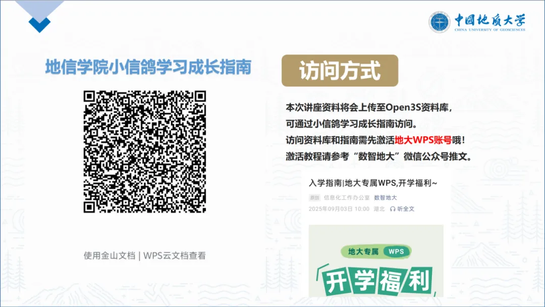 每一期的“小信鸽学子讲坛”都会将PPT或是录屏等资料上传至Open3S资料库,以供同学们日后学习参考,同学们可以通过“小信鸽学习成长指南”访问资料库回顾每一期的精彩内容。