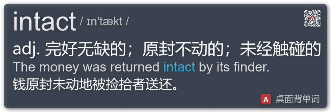 ▲碎片时间学外语,真正无痛背单词!点击上方卡片一键关注当描述事物 “保持完整,未受损害” 的状态时,不少人会在 intact 和类似词汇间犹豫不决。实际上,intact 有着独特的语义和丰富用法,它不仅能形容物体外观的完好无损,还可表示抽象事物如体系、关系等的完整无缺。今天,借助桌面背单词软件,我们将全方位解读 intact,帮你分清用法、了解词源、掌握派生,让你的英语表达更加准确。
